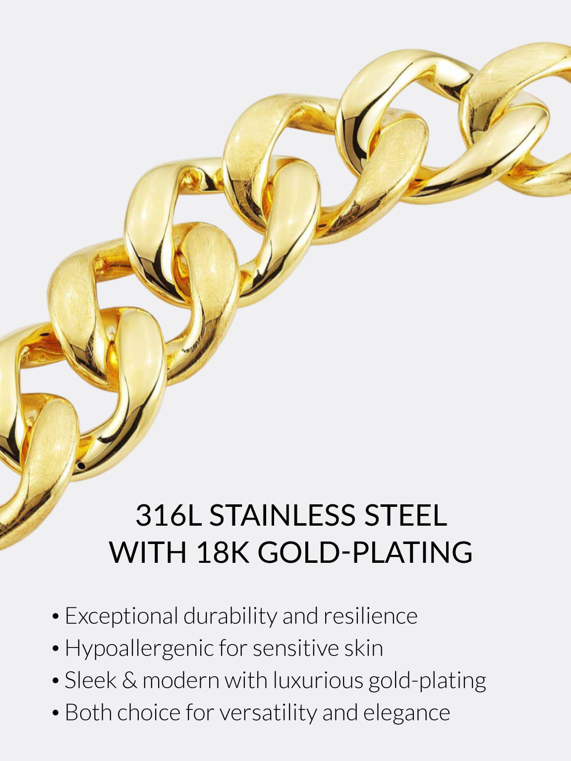 Enduring Quality and Elegance: Our jewelry crafted from surgical grade 316L Stainless Steel is not only built to last with superior strength and corrosion resistance, but it also offers a touch of sophistication with options in 18k Gold Plating. This ensures each piece remains pristine and radiant through daily wear.