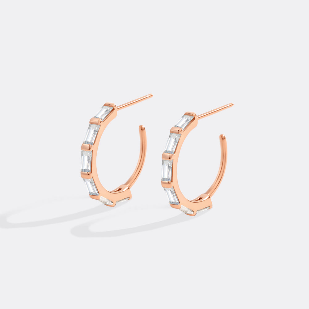 Elevate your everyday with a touch of refined brilliance. These hoops feature a sleek silhouette adorned with baguette-cut white diamonds, creating a radiant and timeless look that transitions effortlessly from day to night.