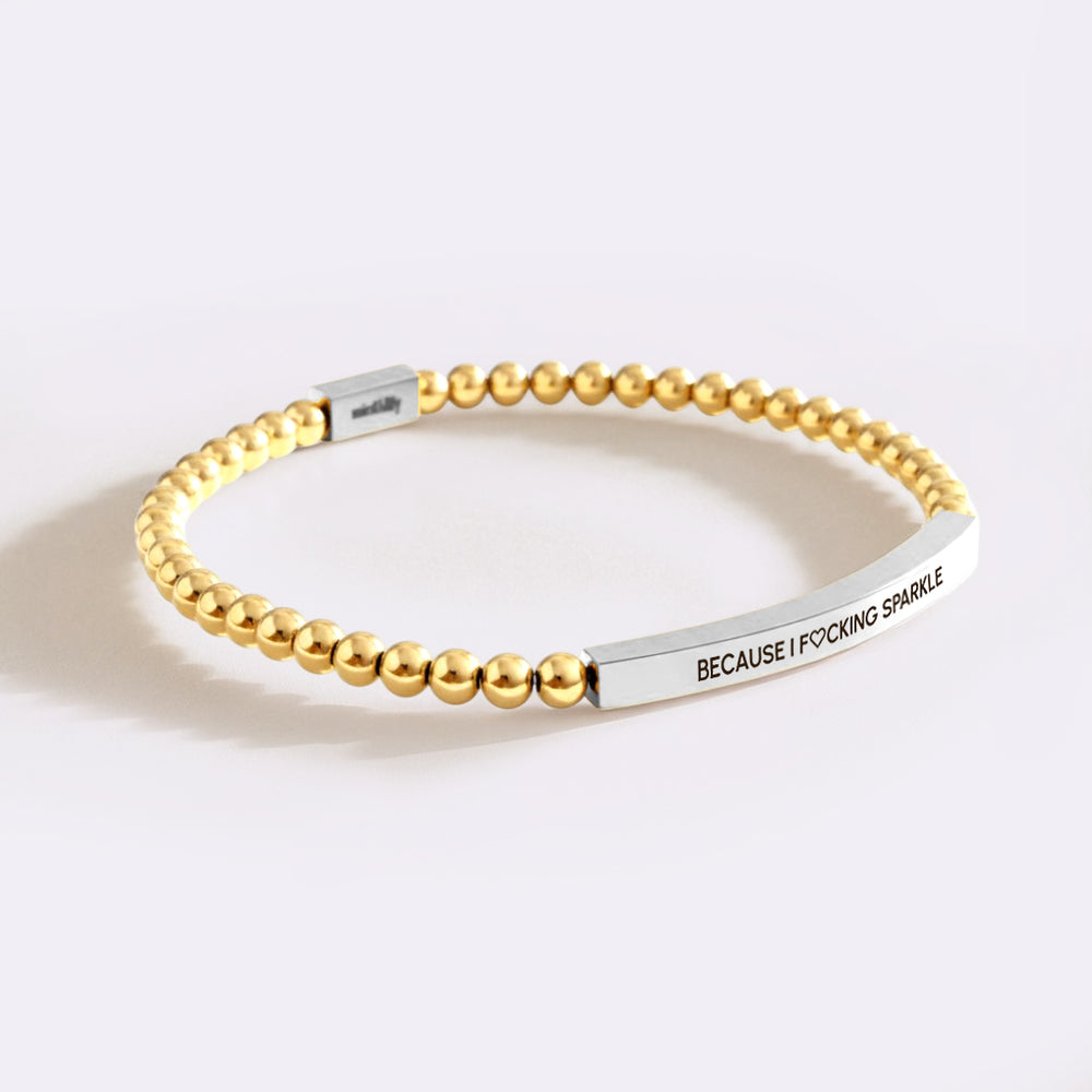 Shine unapologetically with this bold beaded bracelet, featuring the statement “Because I F**ing Sparkle.” Made to celebrate confidence, attitude, and a little bit of sass, it’s the perfect reminder to own your sparkle every single day. Wear it solo for a standout vibe or stack it with your favorites for extra shine.