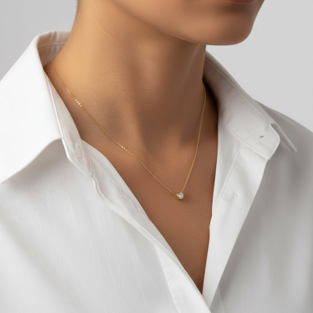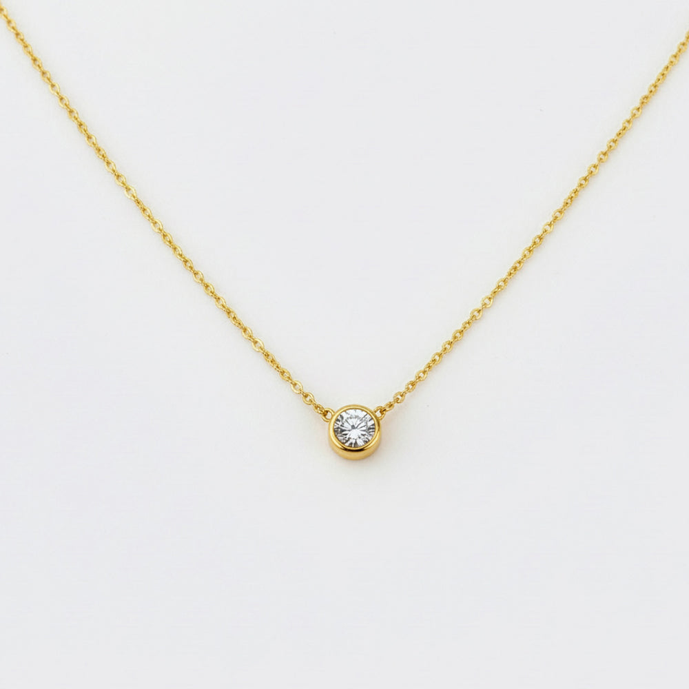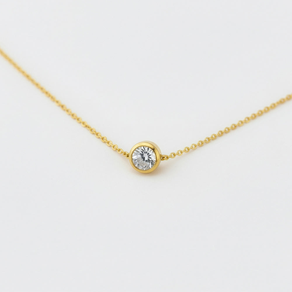 This Classic Bezel Set Solitaire Necklace features a luminous bezel-set CZ stone, showcasing a touch of elegance with its timeless design. This piece is perfect for adding a sophisticated and graceful component to any look.