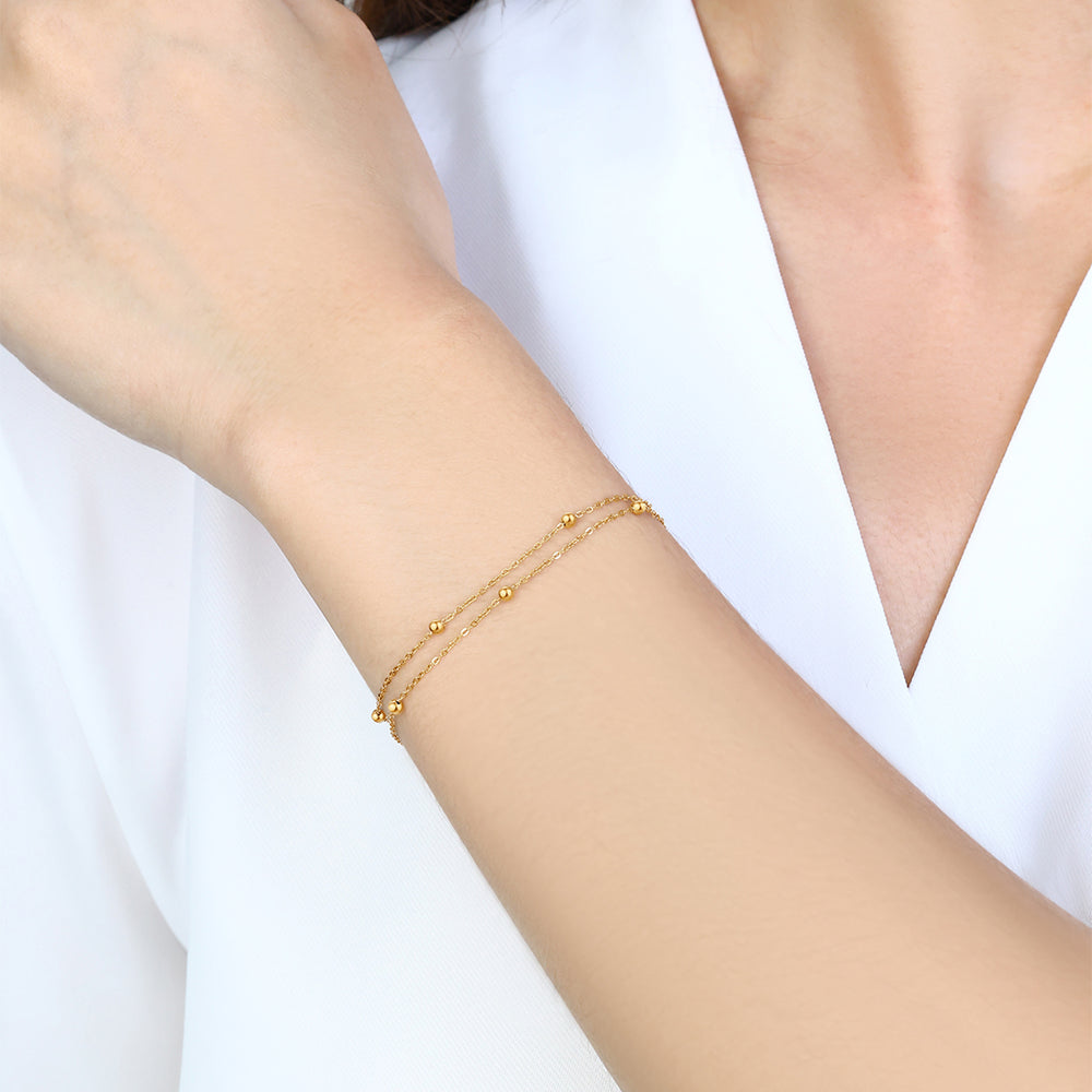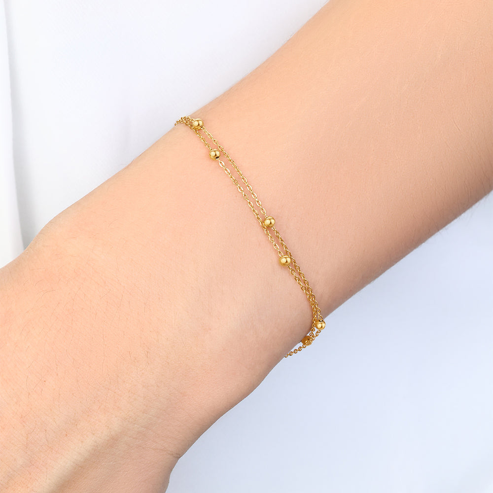 Elevate your wrist game with the Double Chain Bracelet: a sleek, layered design featuring two delicate chains intertwined to create a chic, modern statement. With bobble detailing and a versatile length, it’s perfect for stacking or wearing solo.