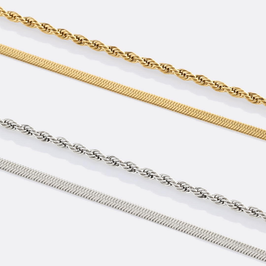 The classic, everyday, wearable, and stylish herringbone chain meets its ideal partner in the timeless rope chain. Joined at the clasp, this two-in-one bracelet is going to set your stack standard.