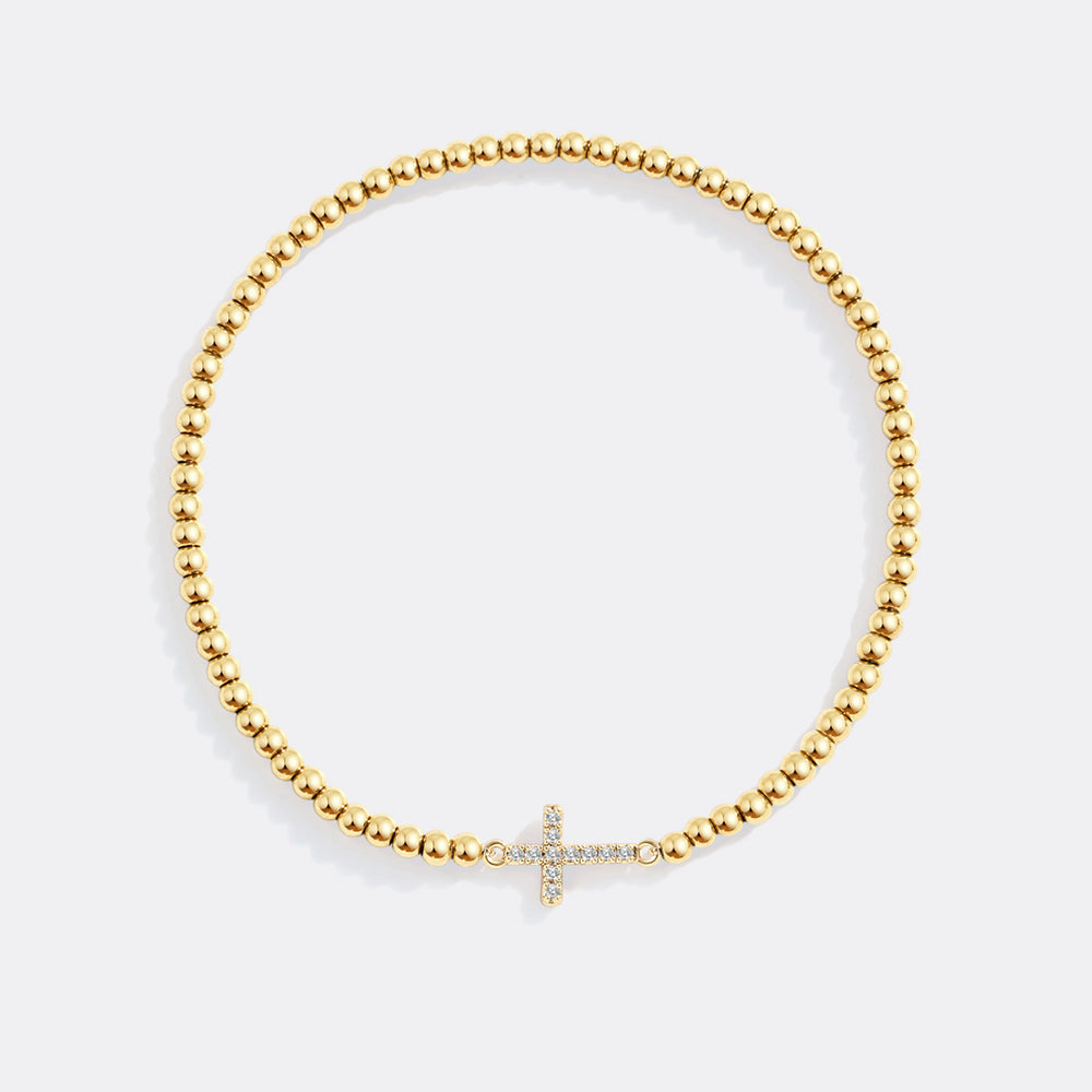 This chic bracelet features gold beads beautifully strung together, complemented by a sparkling diamond cross. Ideal for stacking or wearing solo, this bracelet makes a thoughtful gift or a stylish way to celebrate your faith.