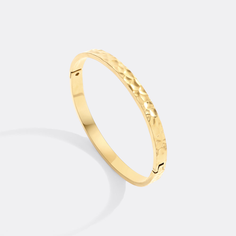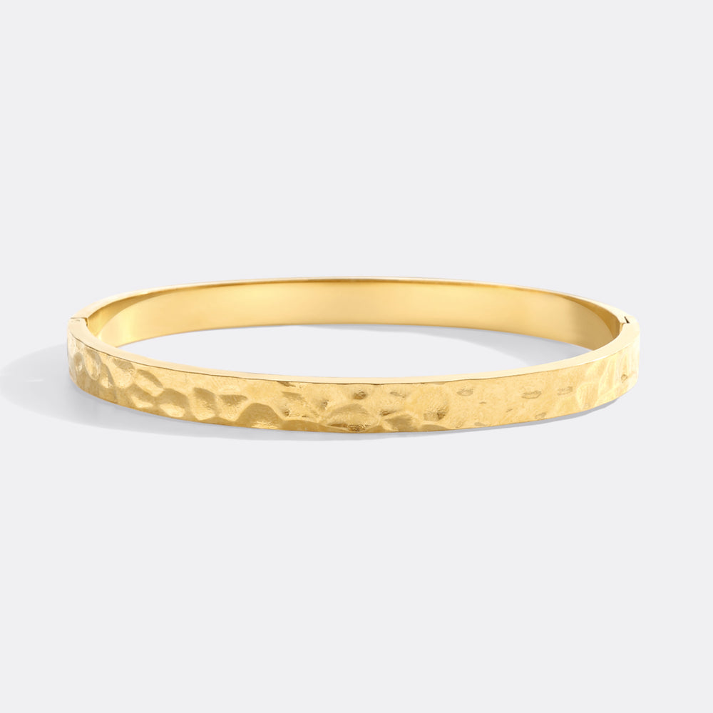 A hinging hammered cuff catches the light from all angles. Secured with a hinge and clasp, this secure bracelet can travel with you anywhere and stacks well.
