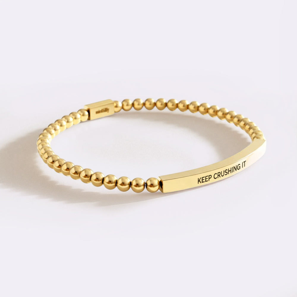 Stay driven. Stay unstoppable. The Keep Crushing It Beaded Inspire Bracelet features sleek silver beads and an empowering charm that celebrates your determination and hustle. A stylish reminder to keep pushing forward, chase your goals, and celebrate every win—perfect for go-getters and dream chasers alike.