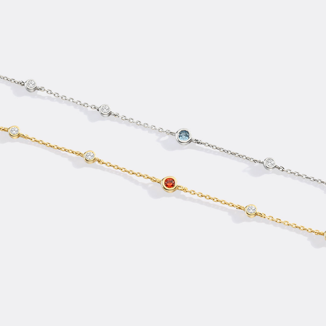 Celebrate every moment with a delicate birthstone bracelet, featuring your chosen gem framed by sparkling white gemstones. Perfect for layering or wearing solo, it adds a personal touch that feels both meaningful and timeless.