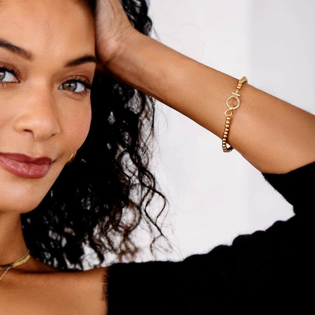 Delicate gold beads meet a mint charm clasp for a playful twist. Style it solo or personalize with charms. Effortless, versatile, and perfect for stacking—your bracelet, your way.