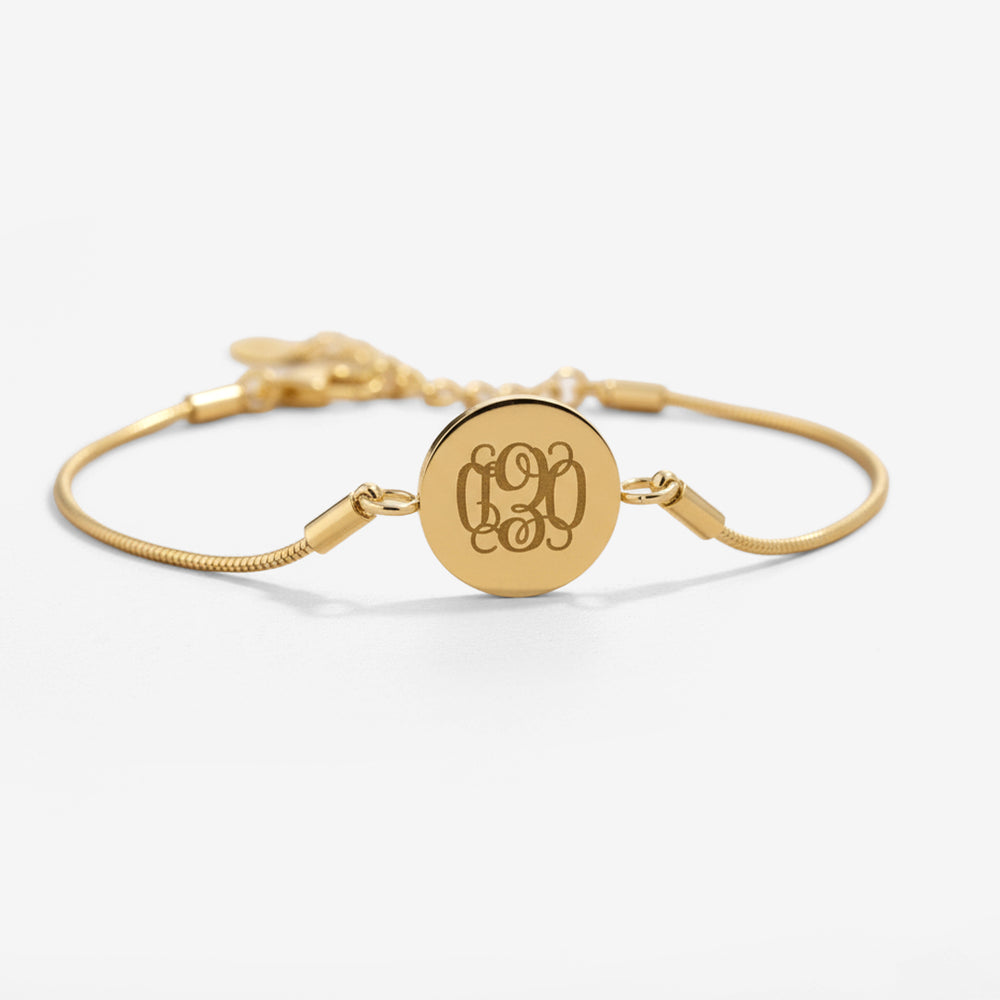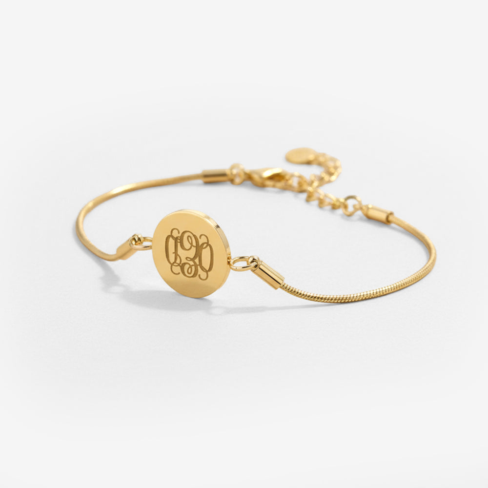 Simple yet elegant, the Monogram Initial Disc Bracelet features a sleek disc engraved with your initial. Perfect for everyday wear, it’s a timeless piece that adds a personal touch to any outfit.