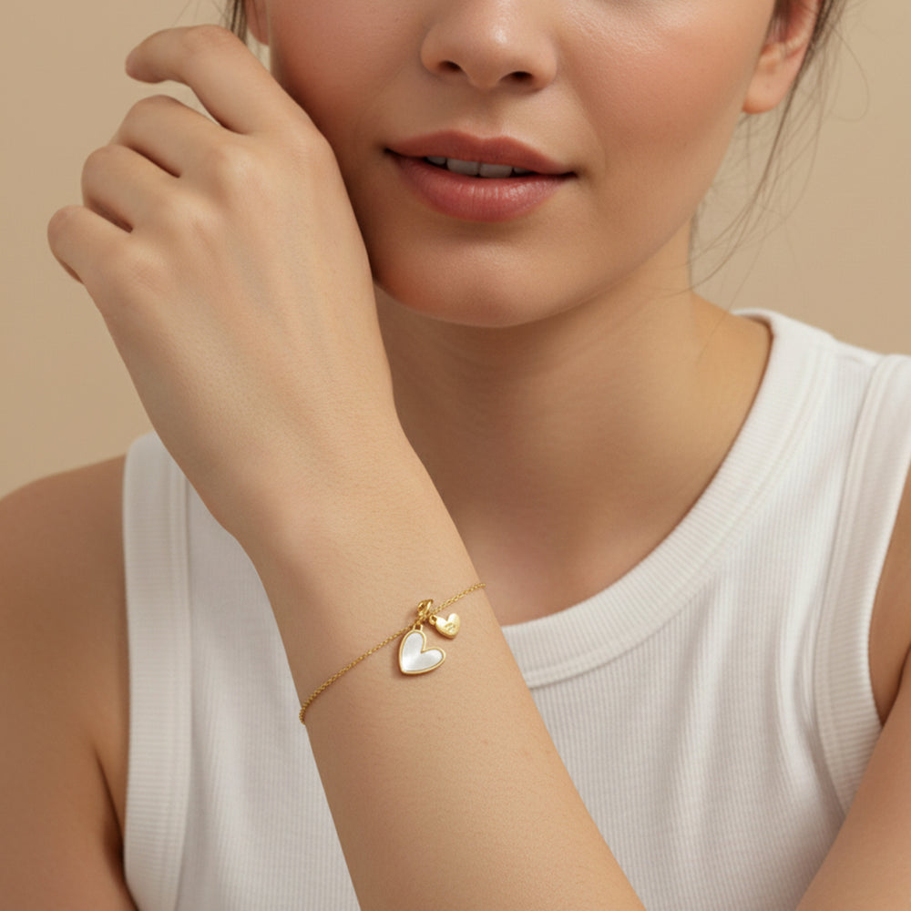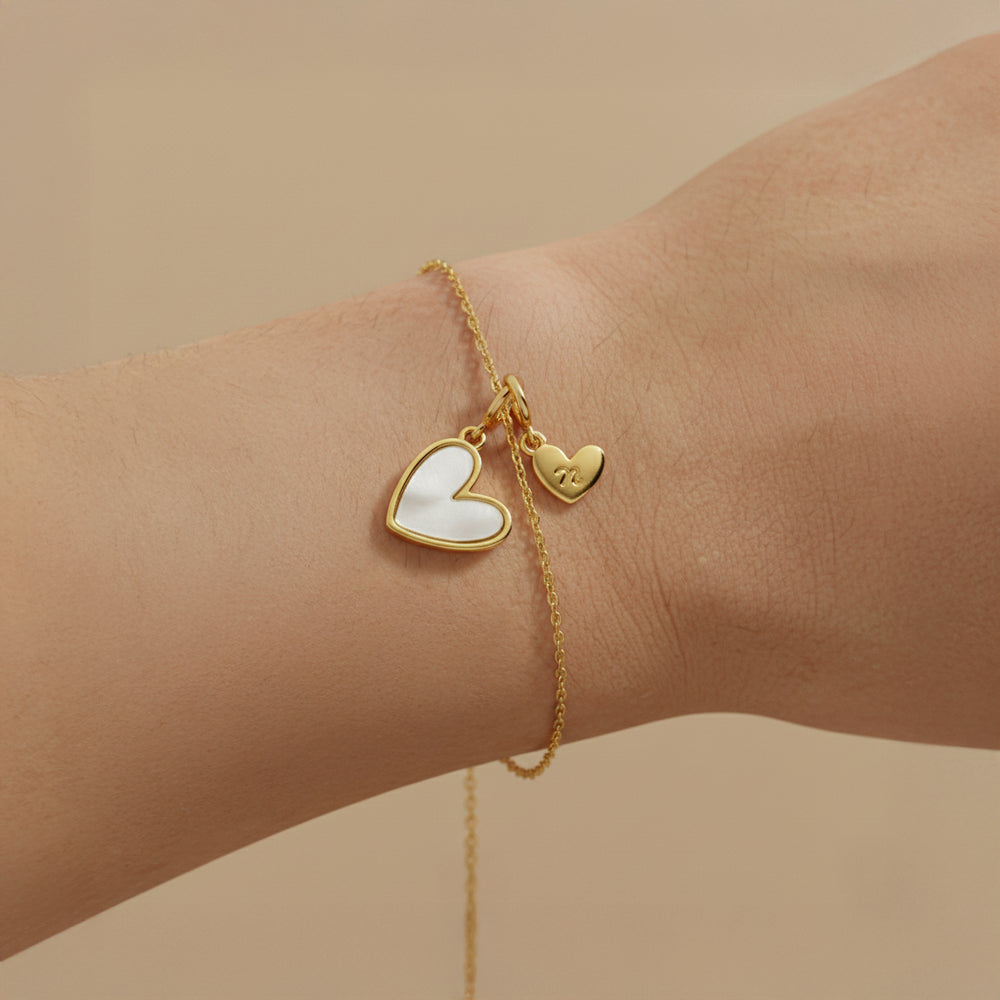 This Mother of Pearl Bracelet beautifully combines personal significance with elegant design. This charming bracelet features a heart-shaped charm crafted from lustrous mother-of-pearl, complemented by a customizable initial charm. Your perfect fit, every time.