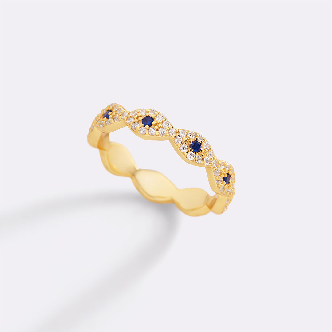 This gold evil eye ring wraps your finger in 360 degrees of protective charm with its sparkling pavé design. Perfect for adding a touch of elegance to your everyday look while keeping negative vibes at bay.