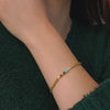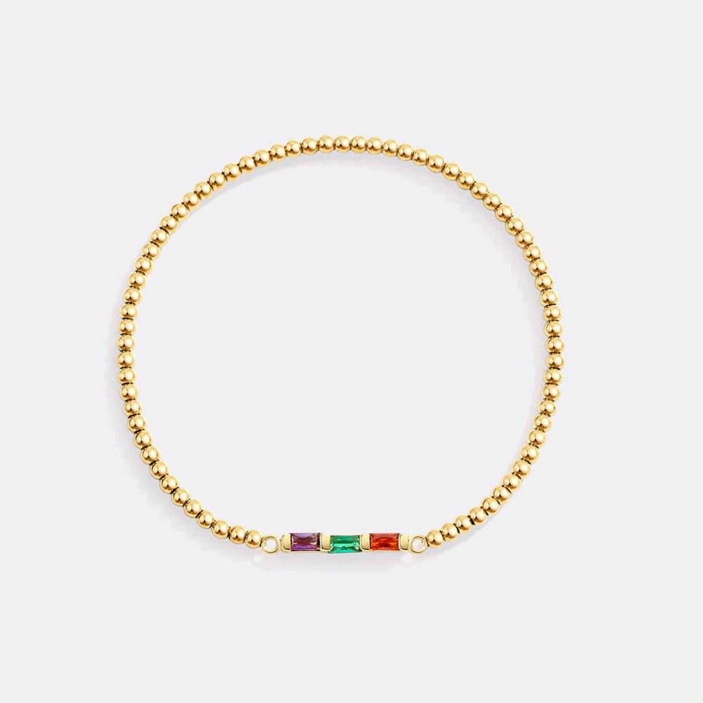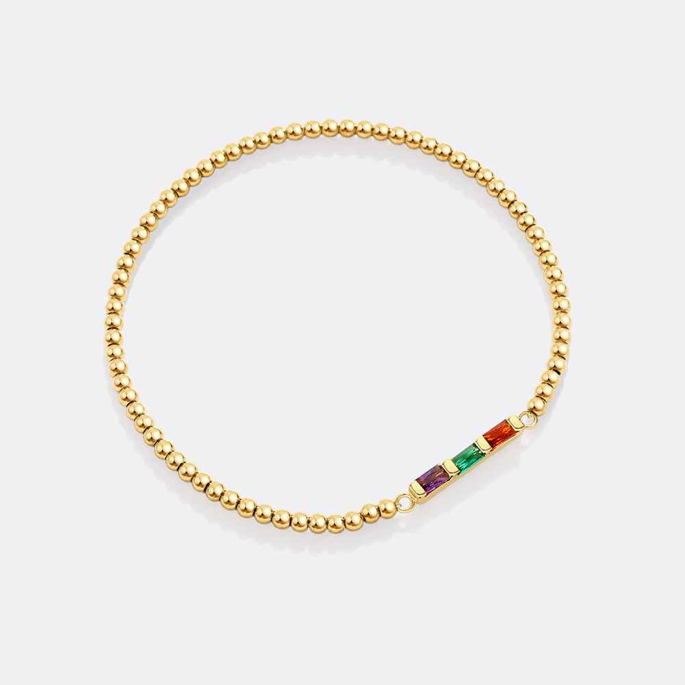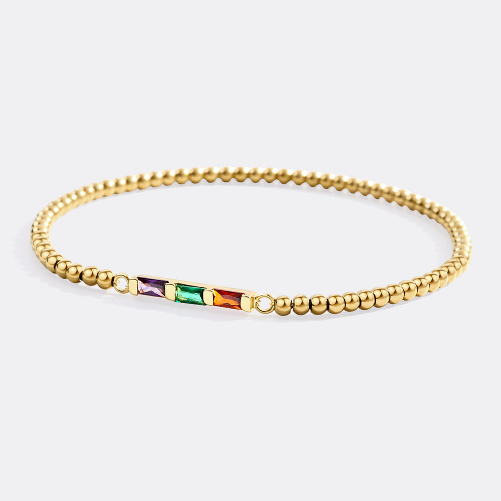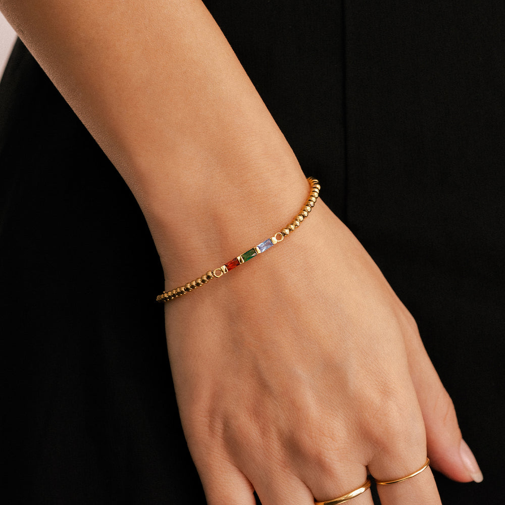 This chic bracelet features gold beads beautifully strung together, complemented by your choice of 1-5 sparkling birthstones representing the twelve (12) months of the year. Ideal for stacking or wearing solo, this bracelet makes a thoughtful gift or a stylish way to celebrate your own special day.