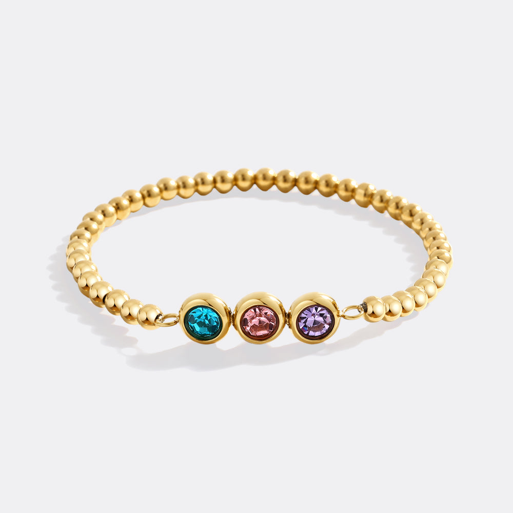 This chic bracelet features gold beads beautifully strung together, complemented by your choice of 1-5 sparkling birthstones representing the twelve months of the year. Ideal for stacking or wearing solo, this bracelet makes a thoughtful gift or a stylish way to celebrate your own special day.