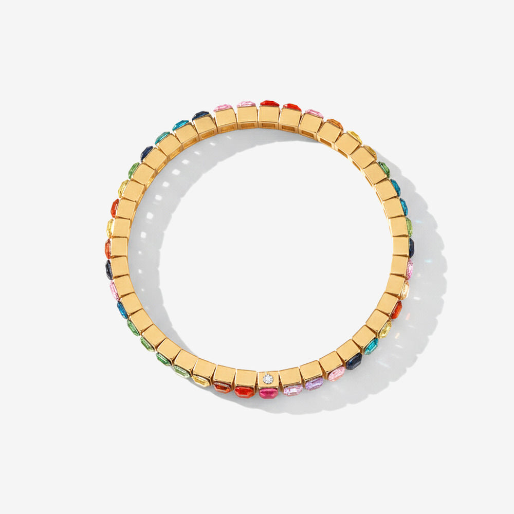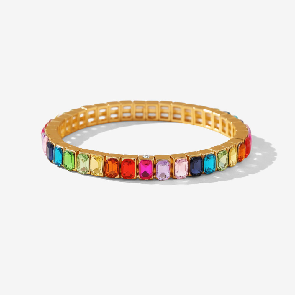 Mint & Lily's Rainbow Baguette Beaded Bracelet features a vibrant array of baguette gemstone beads, artfully arranged to create a colorful and eye-catching design. The stretchy band ensures a comfortable fit, making it easy to wear and style.