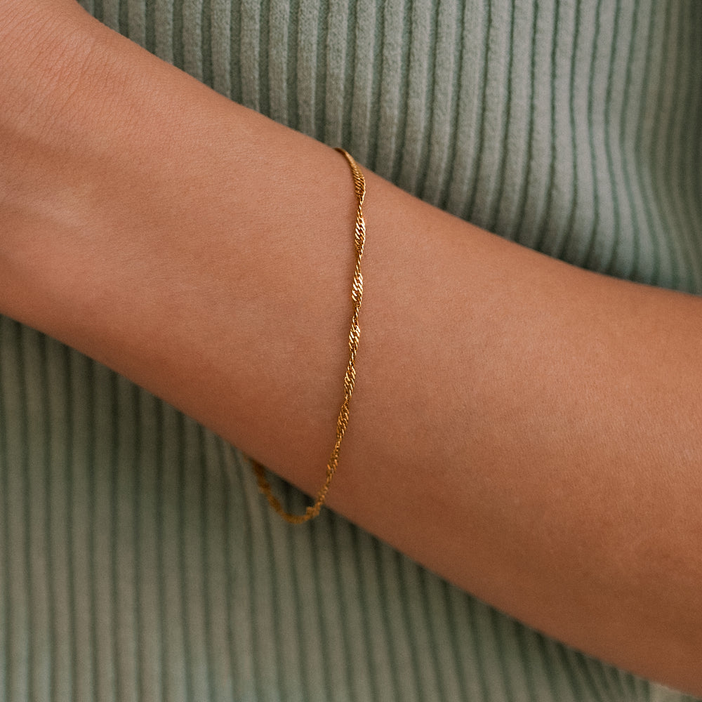 Mint & Lily's Singapore Twist Bracelet showcases a refined twist on a classic design. Featuring a Singapore chain with a delicate, twisted texture, this bracelet offers a sophisticated and elegant look. The twisted links catch the light beautifully, creating a subtle shimmer that enhances its timeless appeal.